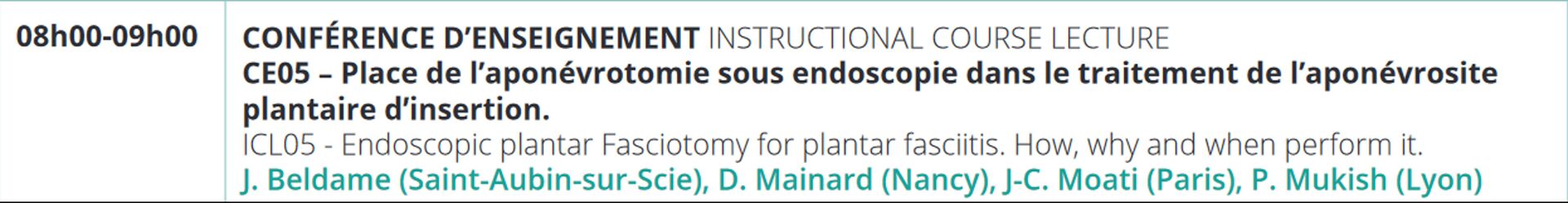 Le Dr Julien Beldame, en collaboration avec le Dr Mainard (Nancy), le Dr Moati (ICP Paris), et le Dr Mukish (Lyon), a exposé les résultats de ses recherches sur l'utilisation de l'aponévrotomie sous endoscopie dans le traitement de l’aponévrosite plantaire d’insertion. Cette présentation a suscité un vif intérêt parmi les participants, offrant des perspectives nouvelles et prometteuses pour le traitement de cette affection.