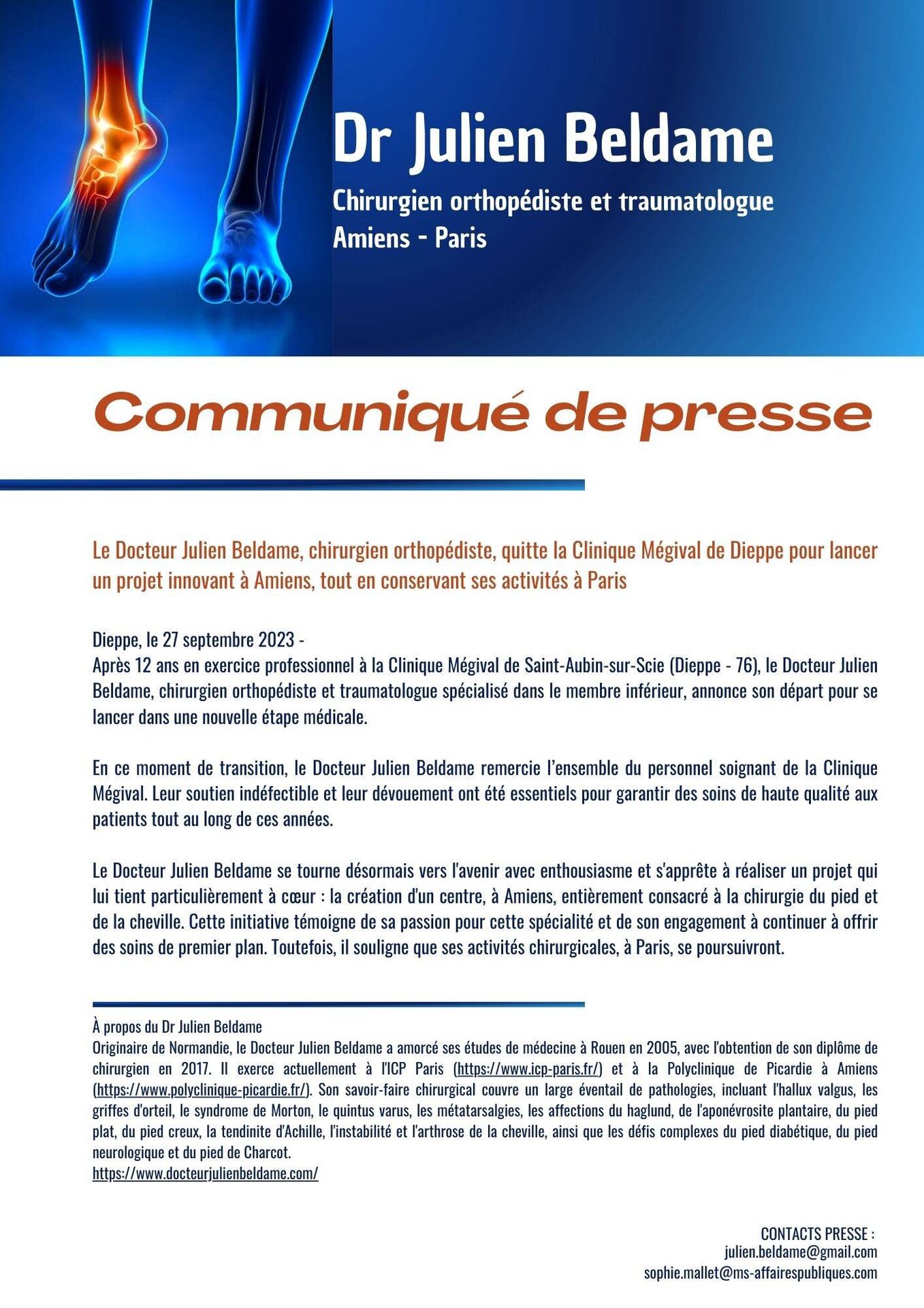 Après 12 ans en exercice professionnel à la Clinique Mégival de Saint-Aubin-sur-Scie (Dieppe - 76), le Docteur Julien Beldame, chirurgien orthopédiste et traumatologue spécialisé dans le membre inférieur, annonce son départ pour se lancer dans une nouvelle étape médicale.
