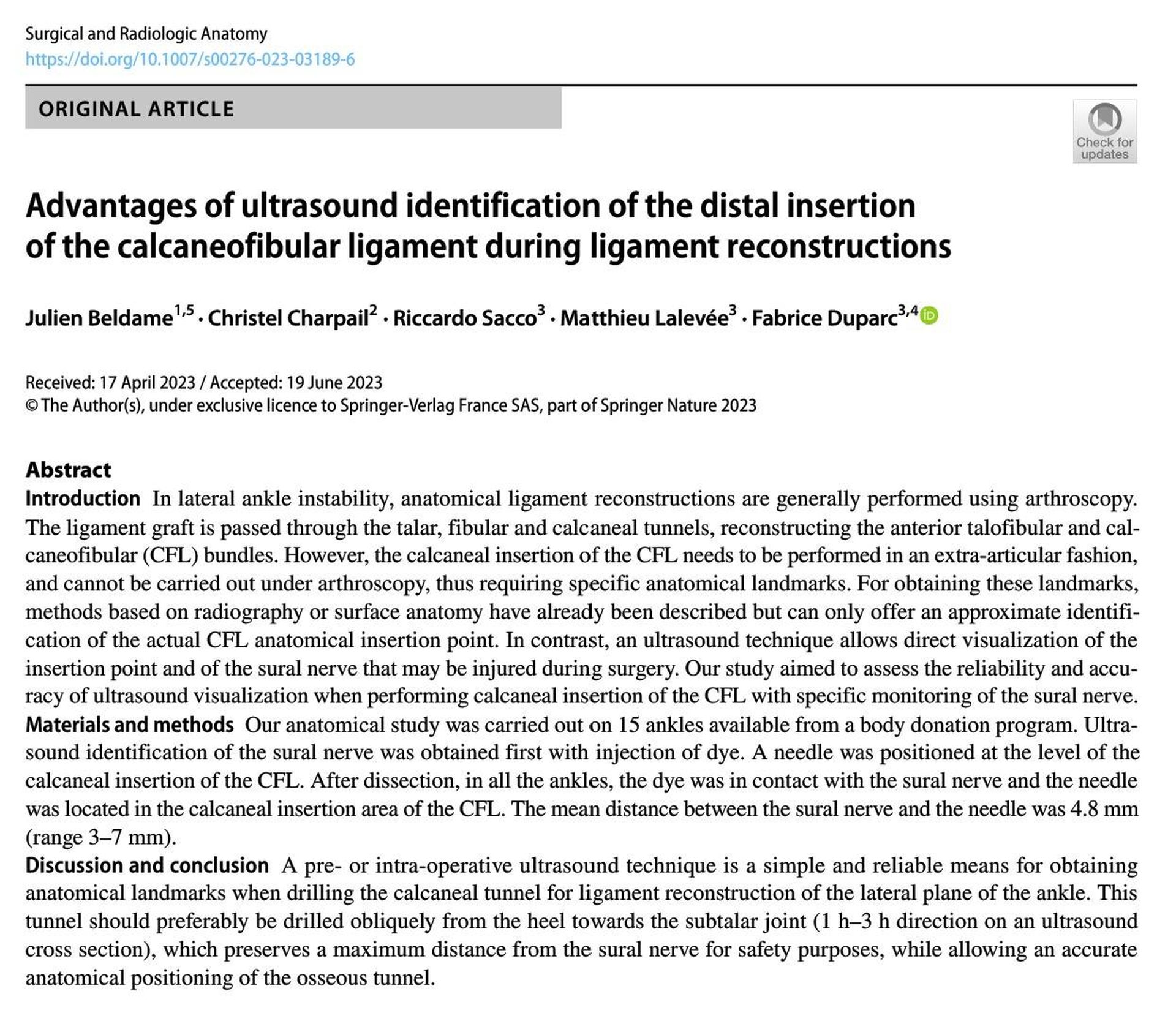 Les lésions du ligament calcanéo-fibulaire sont fréquentes et peuvent résulter d'un traumatisme ou d'une instabilité chronique de la cheville. Les reconstructions ligamentaires sont souvent nécessaires pour restaurer la stabilité de la cheville et éviter les complications à long terme. Cependant, l'identification précise de l'insertion distale de ce ligament lors de la chirurgie reste un défi.